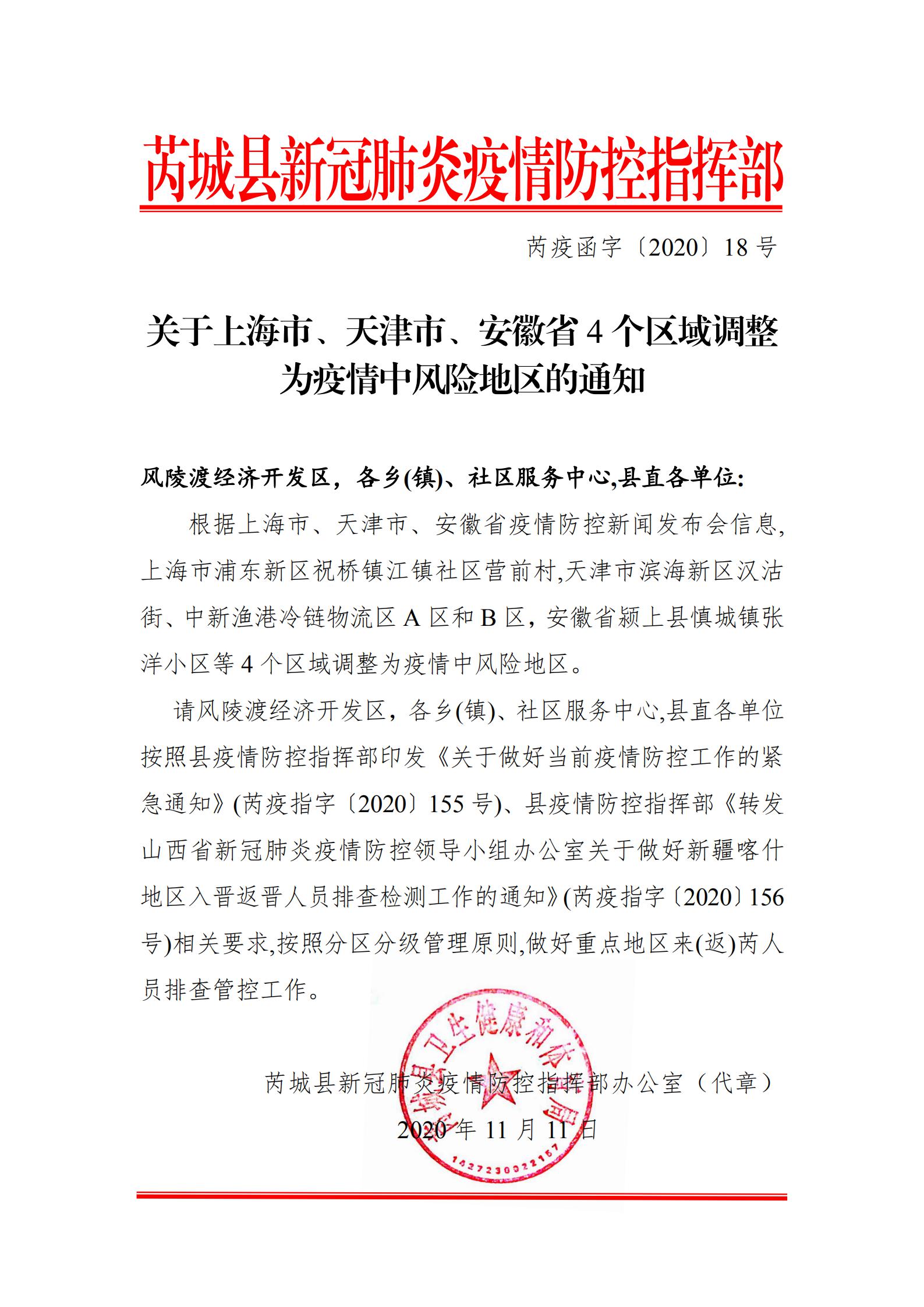 芮疫函字〔2020〕18号(关于上海市、天津市、安徽省4个区域调整为疫情中风险地区的通知)
