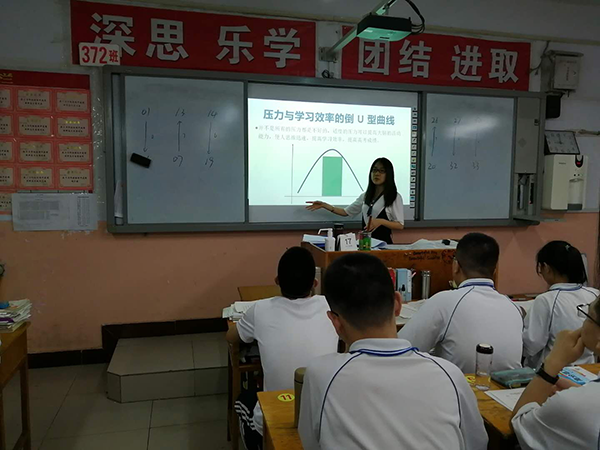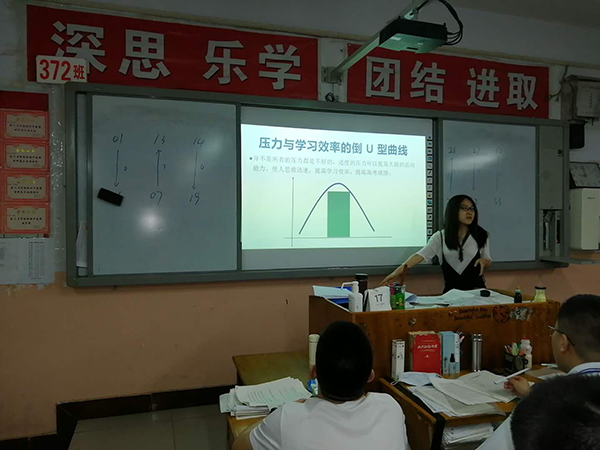 帮助同学们了解压力和学习效率之间呈倒“U”形曲线关系。学习效率是随着压力水平的上升而提高,到达中间高峰后学习效率就随压力水平的上升而下降了。认识到压力并不一定都是给我们带来消极的后果,所以有压力不一定是一件坏事。中等强度的压力有利于充分提高我们的学习效率,有适度的压力存在对我们的成功是必需的。